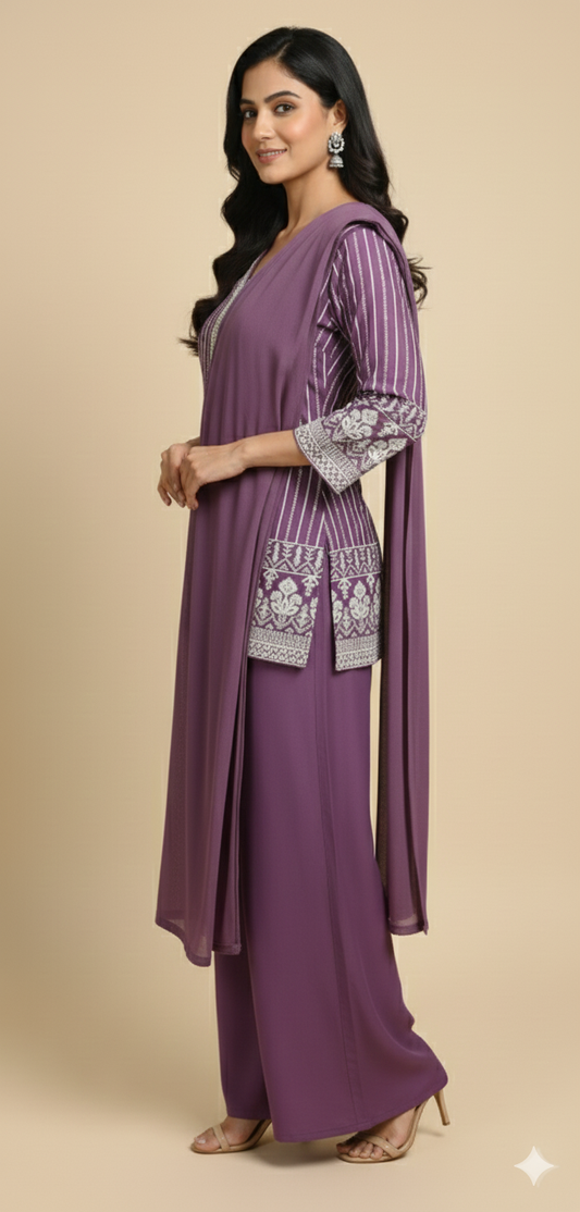 Purple Chinon Zircon & Thread Work Co-ord Set (Short Kurta & Palazzo)
