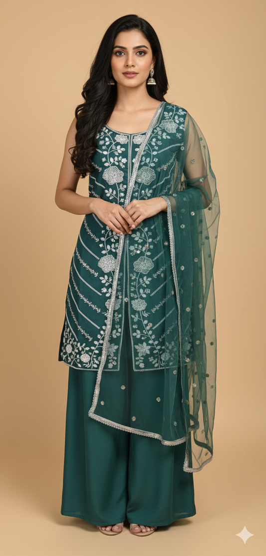 SaleSave 52%💚 Sparkling Dark Green Georgette Palazzo Shrug Set
