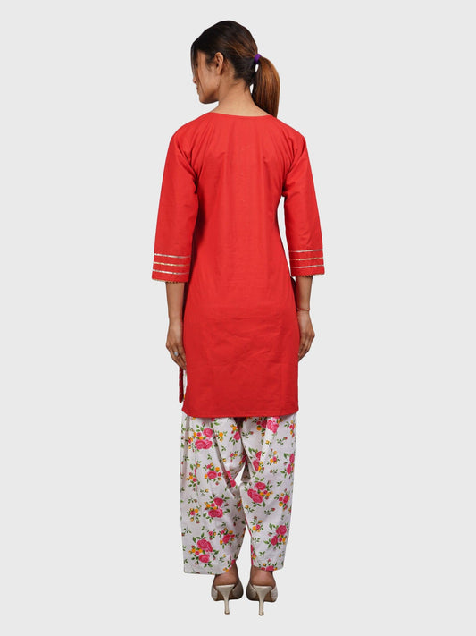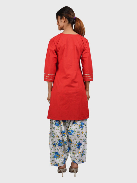 Trendzmy Women Plain Red Kurta with Printed Sky Blue Salwar and Dupatta