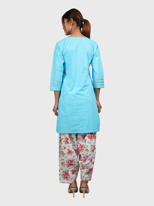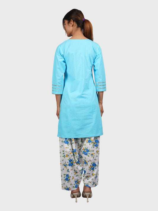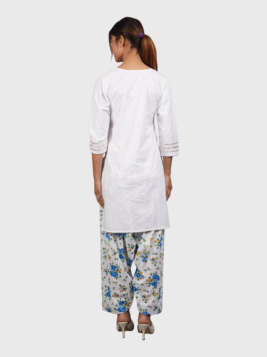 Trendzmy Women Plain White Kurta with Printed Sky Salwar and Dupatta