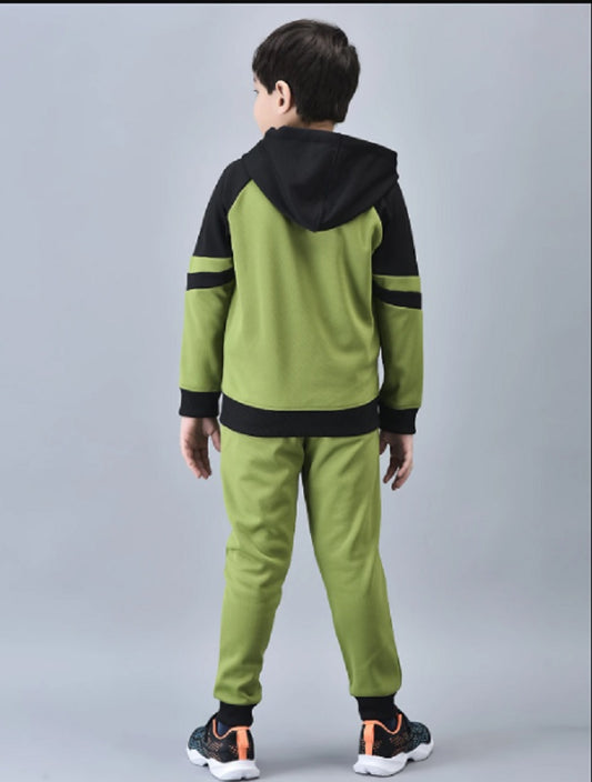Shiv Naresh Boys Olive Green & Black Color blocked Zip-Front Tracksuit with Hood