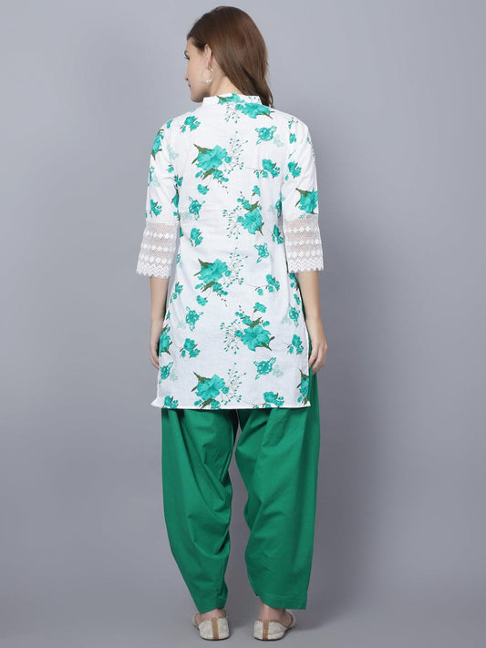 Trendzmy Women Apple Cut Green Floral Print Pure Cotton Straight Kurta Salwar Set