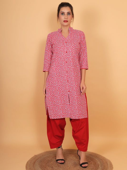 Trendzmy Women Red Floral Printed Cotton Kurta with Solid Red Salwar