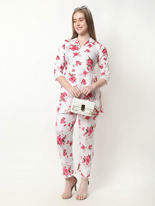 Trendzmy Women White Floral Printed Cotton Coord Set with 3/4 Sleeves