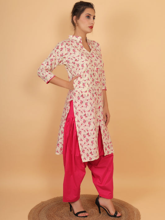 Trendzmy Women Cream and Pink Floral Printed Cotton Kurta with One Side Pocket