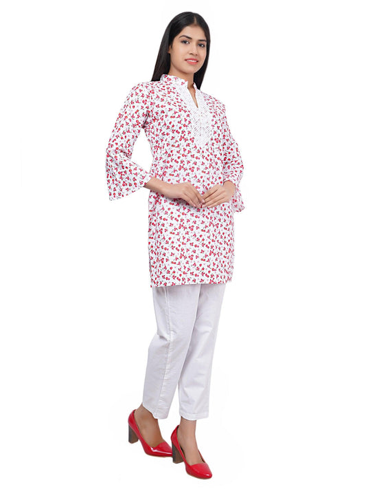 Trendzmy Women White and Red Floral Printed Straight Kurta
