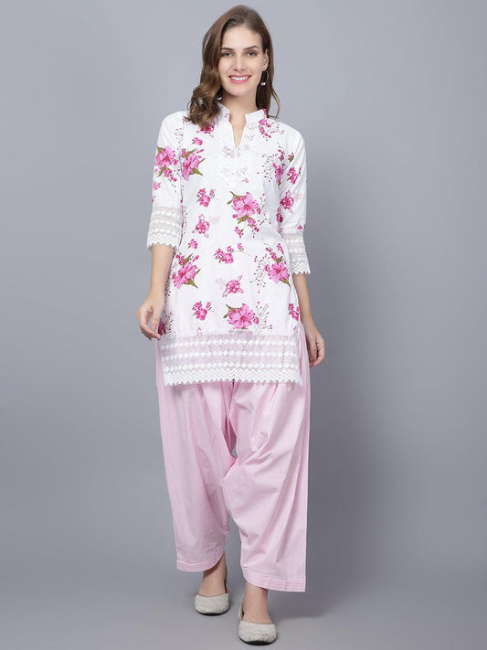 Trendzmy Pack of 2 Set Women Floral Print Cotton Blend Straight Kurta (Pink, White)