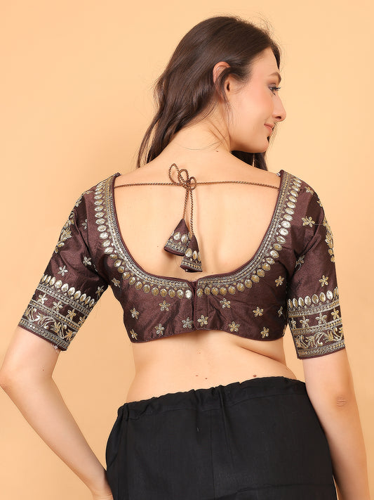Trendzmy Embroidered Choli Cut Brown Cotton Silk Half Sleeve Blouse