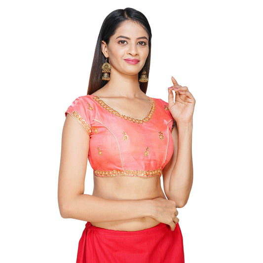 Trendzmy Embroidered Choli Cut Peach Cotton Silk Half Sleeve Blouse