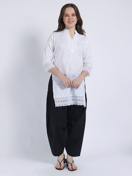 Trendzmy Women Solid White Kurta and Black Salwar Set Pure Cotton