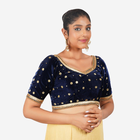 Trendzmy Women Velvet Navy Lace Work Readymade Blouse