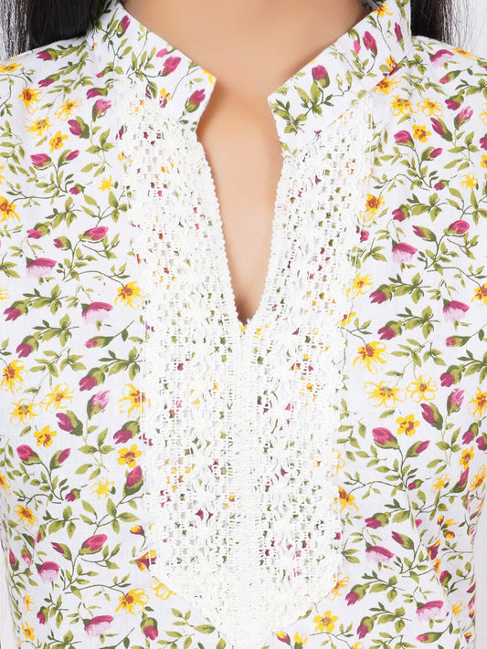 Trendzmy Women White & Green Floral Printed Cotton Kurta with Green Printed Palazzo & Side Pocket