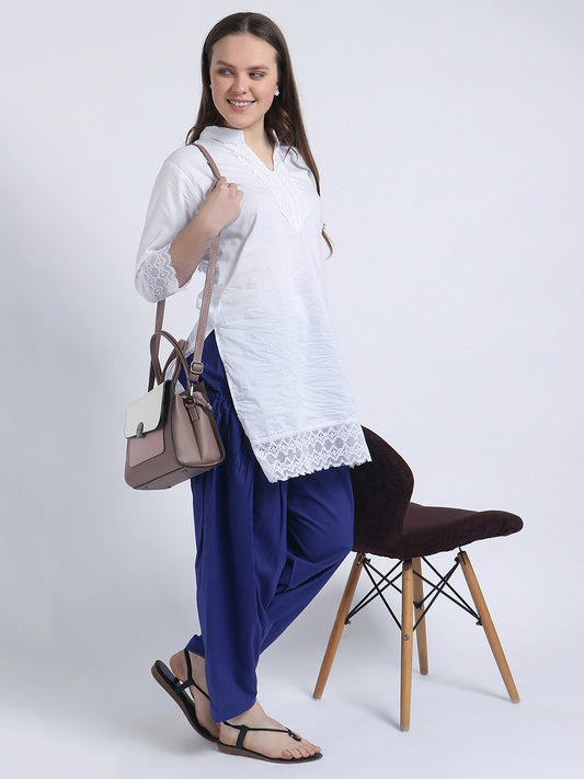 Trendzmy Women Solid White Kurta and Blue Salwar Set Pure Cotton