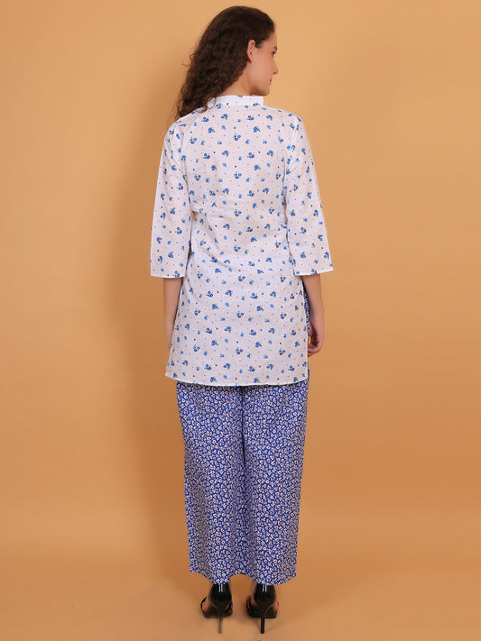 Trendzmy Women White & Blue Floral Printed Cotton Kurta with Blue Printed Palazzo & Side Pocket