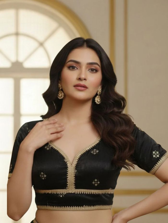 Classic Black Silk-Finish Blouse with Gold Zari Embroidery