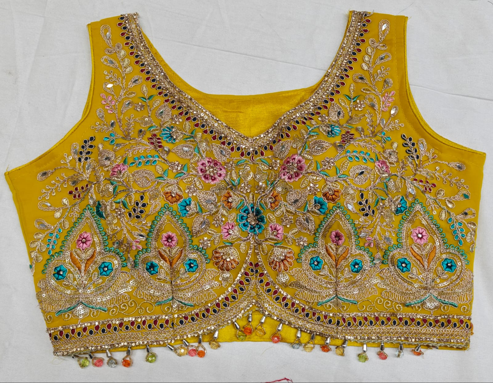Crop Top (Blouse): Features intricate multi-thread handwork across the bodice in lively colors (pinks, blues, and golds), enhanced by delicate bead and Gota hangings along the hemline.