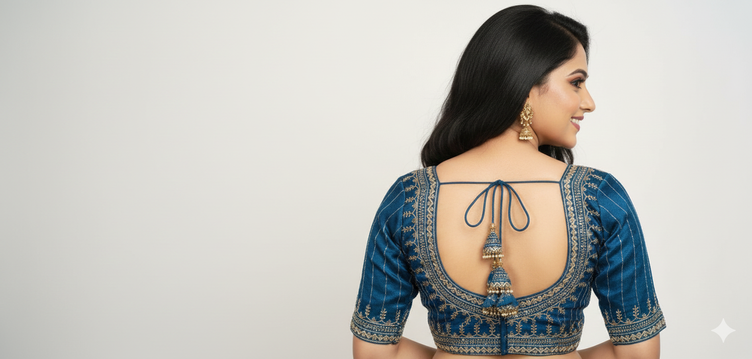 Make a sophisticated statement with this gorgeous Ready-to-Wear Peacock Blue Blouse. Crafted from luxurious cotton silk, this blouse features exquisite gold sequin and thread work, complemented by a striking deep back neck, making it perfect for festive occasions, weddings, and traditional events.