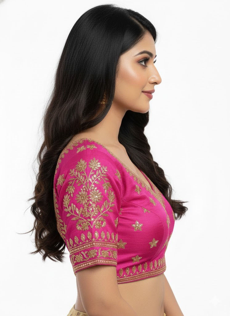 Elevate your saree or lehenga look with this gorgeous Ready-to-Wear Rani Pink Blouse. Crafted from luxurious cotton silk, this blouse features exquisite gold thread work and a striking deep back neck, perfect for showcasing your style at weddings, festivals, and parties.