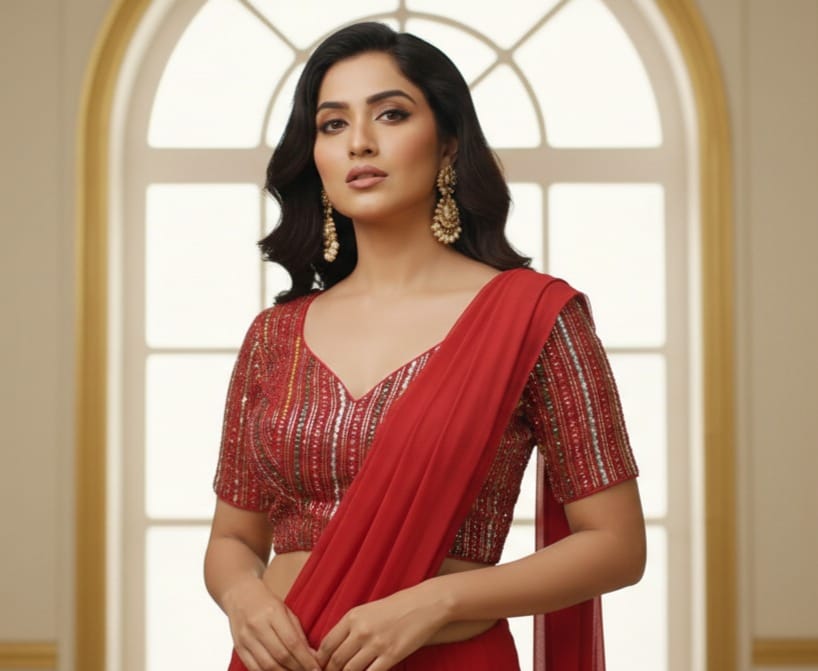 This elegant red blouse features a deep V-neckline with elbow-length sleeves, beautifully adorned with vertical sequin stripes in gold, silver, and red hues. The fitted silhouette adds a touch of sophistication, making it perfect for pairing with sarees or lehengas for festive occasions, weddings, or evening parties.