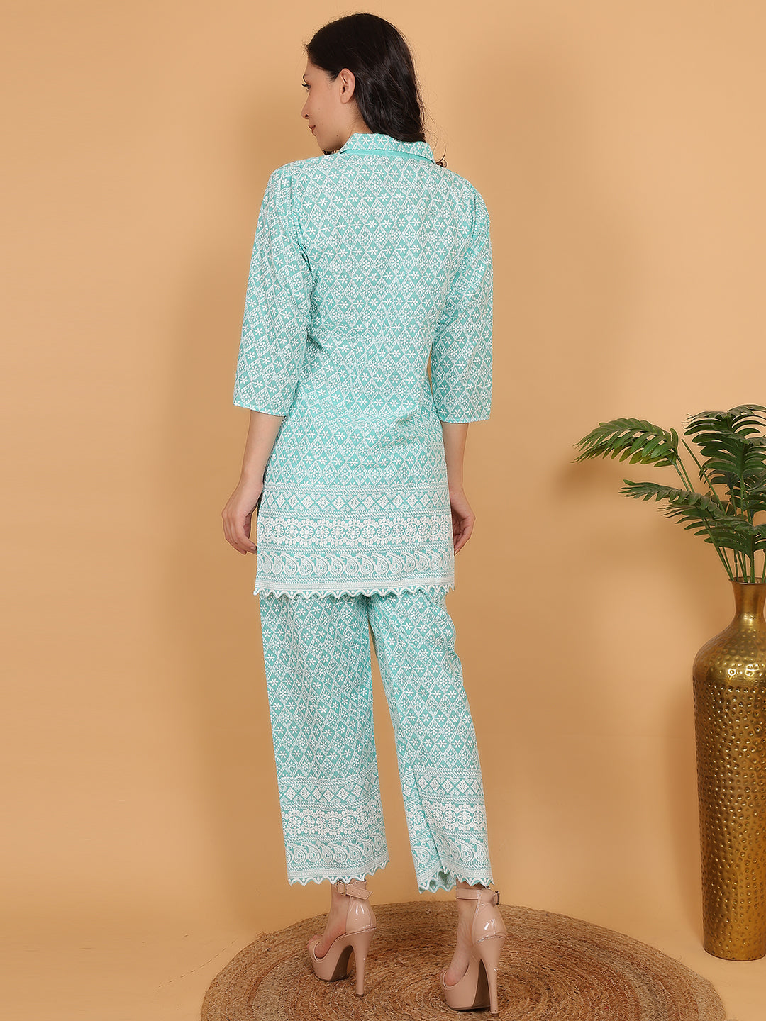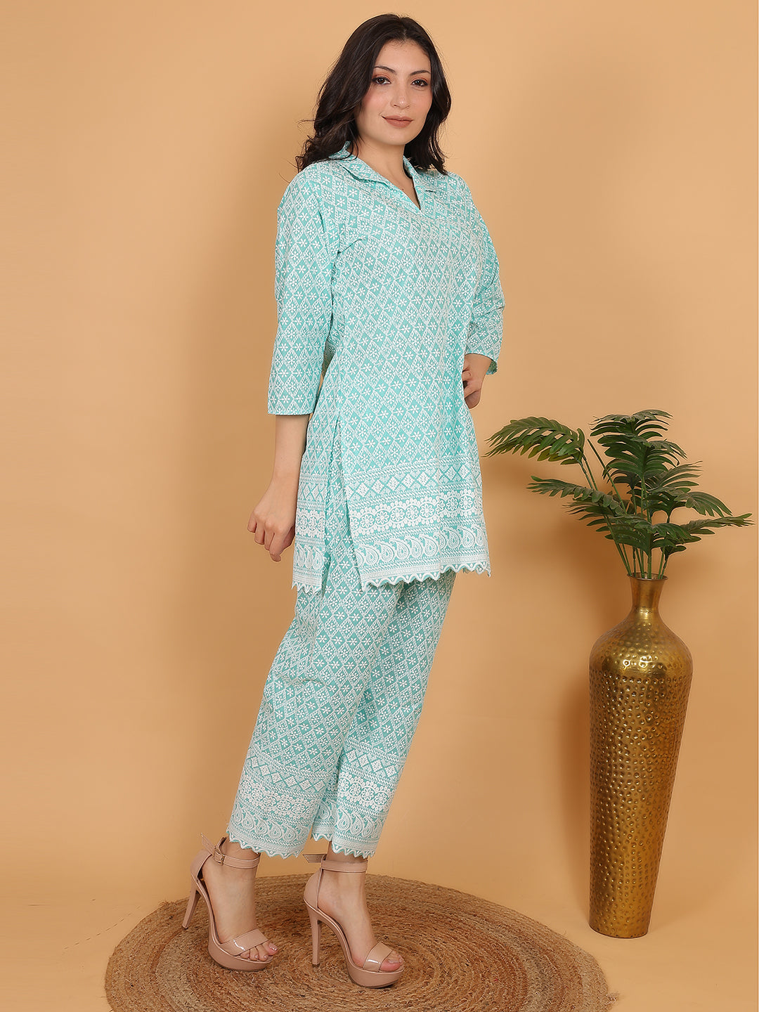 Refresh your ethnic wardrobe with this elegant mint green co-ord set, featuring a beautiful all-over ethnic print. Crafted from breathable cotton fabric, this 3/4th sleeve kurta comes with delicate lace detailing at the hem and cuffs, paired with matching printed straight pants. Ideal for festive gatherings or casual outings, this ensemble blends comfort and chic effortlessly.