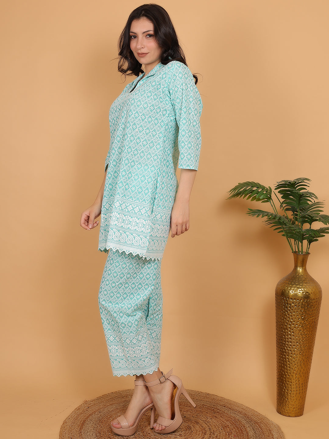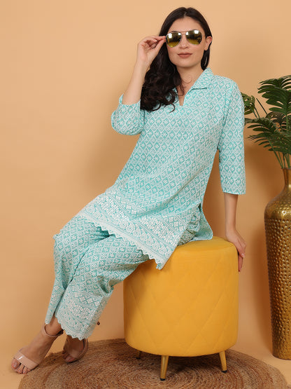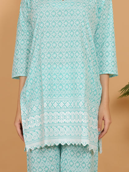 Trendzmy Aqua Green Ethnic Chikan embroidery Cotton Co-ord Set