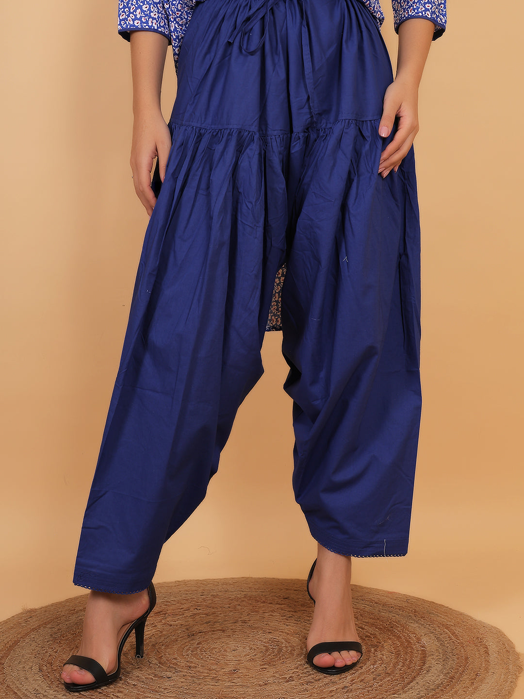 Bottom: Solid blue salwar with a relaxed fit for all-day comfort