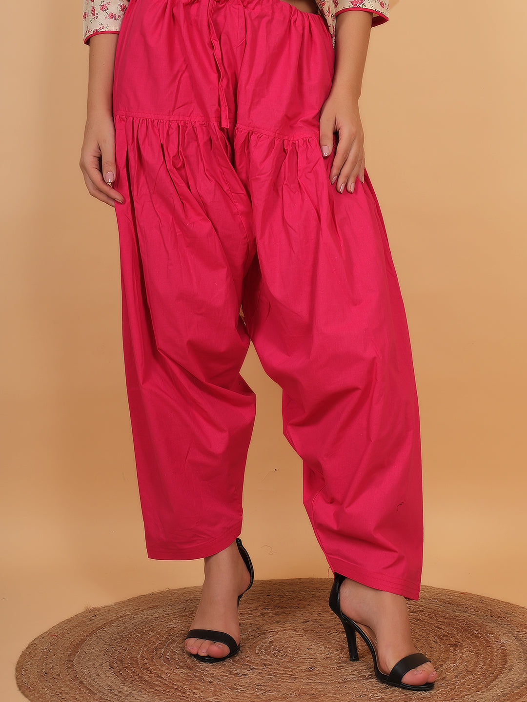 Bring freshness to your ethnic wardrobe with this cream floral printed cotton salwar set. The kurta features an all-over pink floral print with a mandarin collar and three-quarter sleeves, beautifully paired with a solid bright pink salwar for a vibrant, stylish look. Made from soft and breathable cotton, this set ensures all-day comfort, making it perfect for daily wear, office dressing, or casual outings.