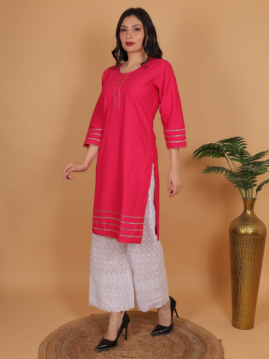 Women Elegant Rani Pink Cotton Kurti & White Embroidered Palazzo Set