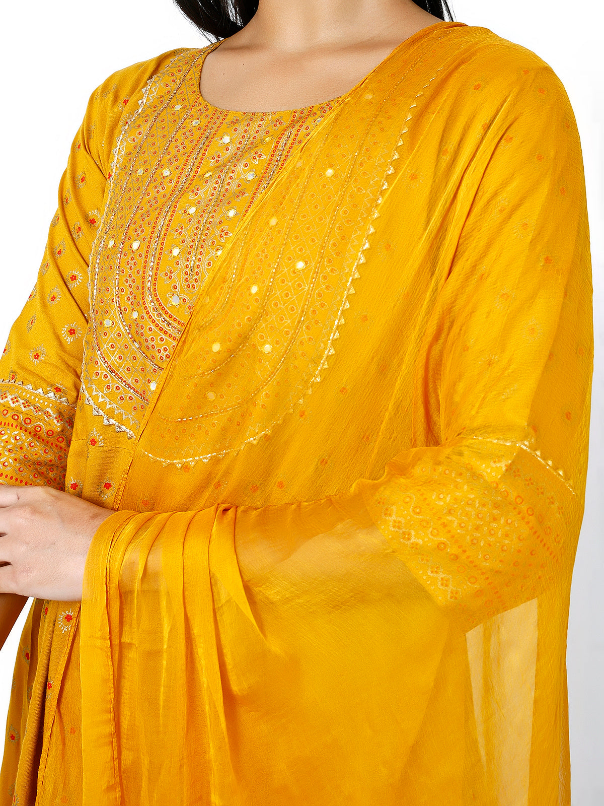 • Kurta: Flowy Anarkali-style silhouette with a round neck and three-quarter sleeves for a chic, sophisticated look.