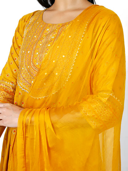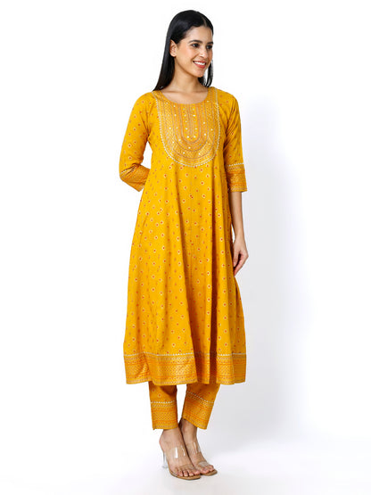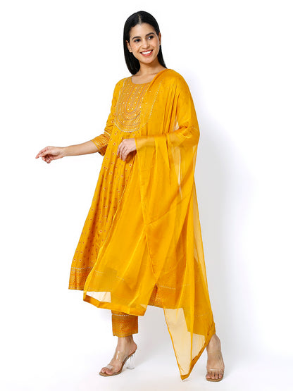Trendzmy Women Mustard Floral Printed Round Neck Anarkali Kurta With Trousers & Dupatta (Plus Size Available)
