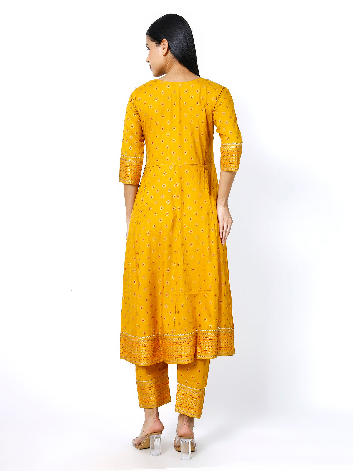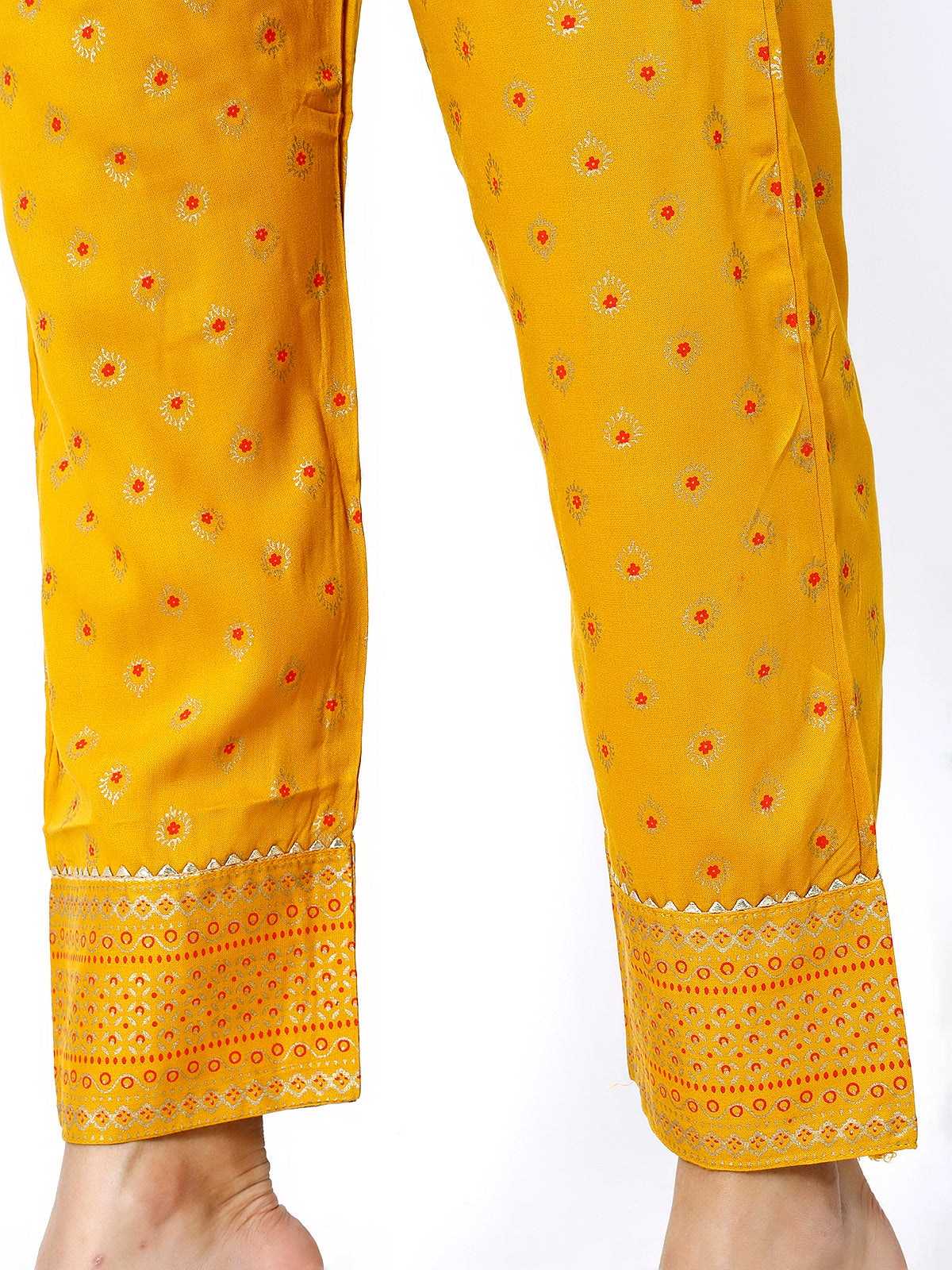 • Design & Pattern: A vibrant mustard color adorned with delicate floral prints that exude timeless beauty.