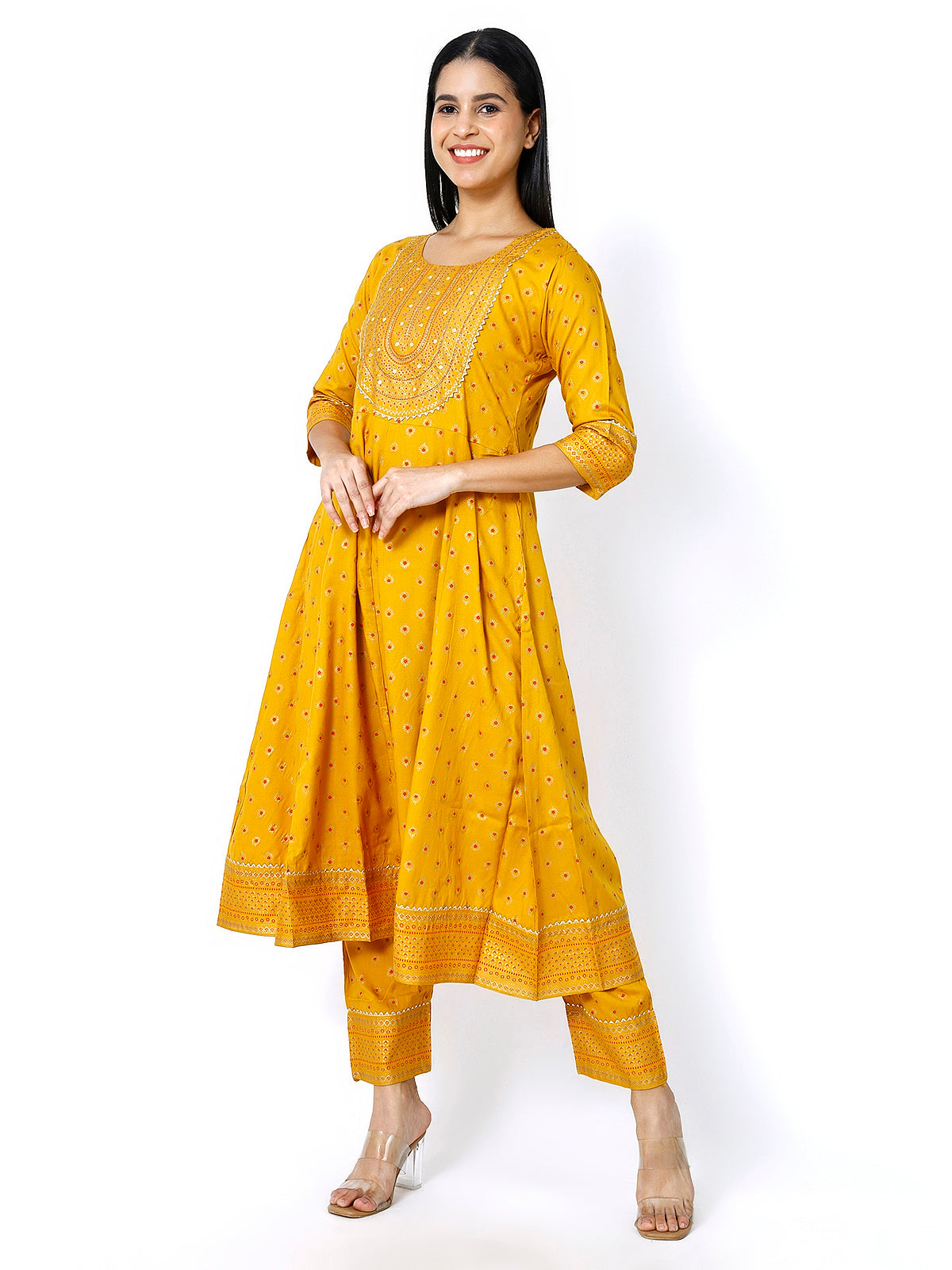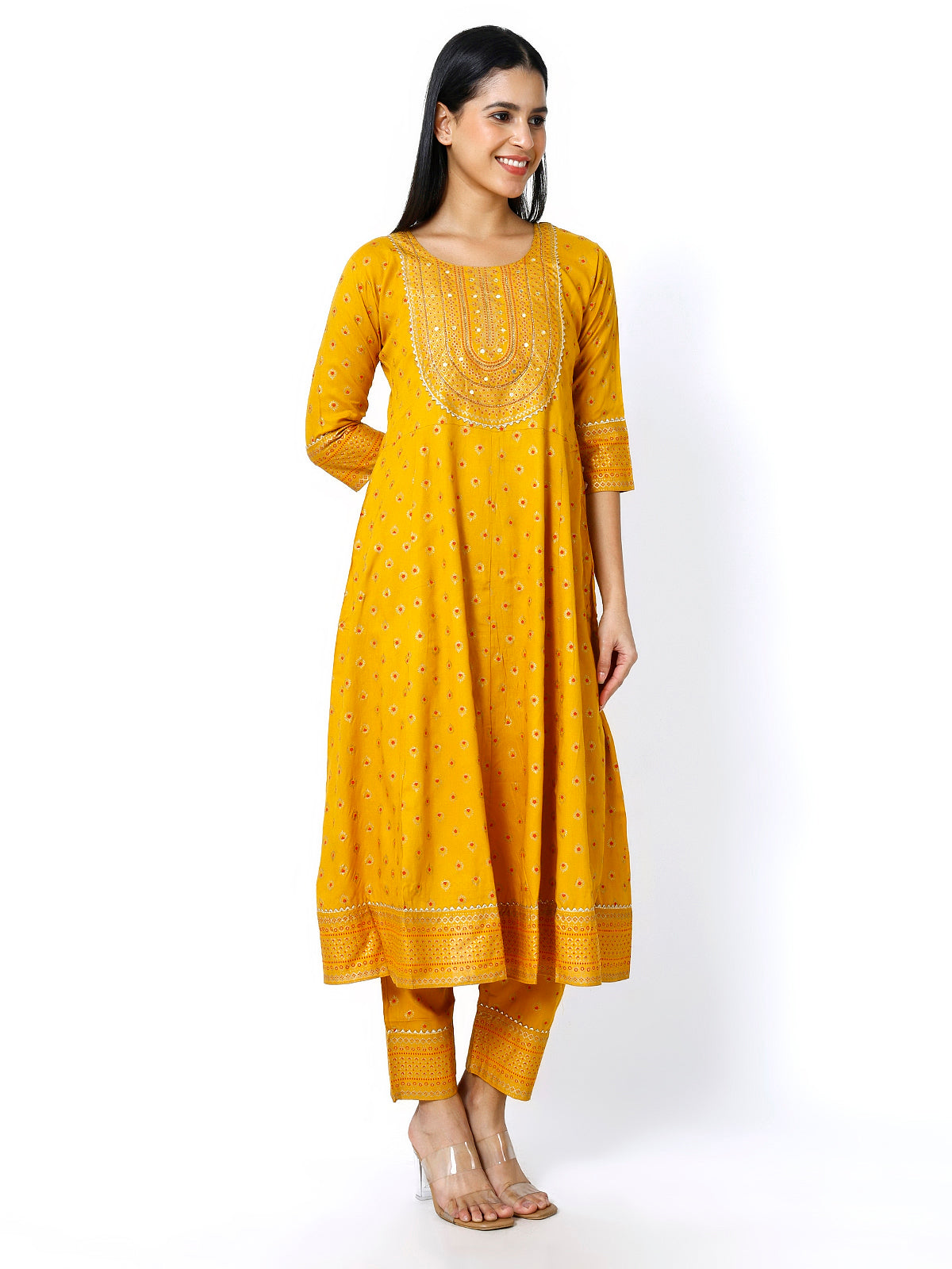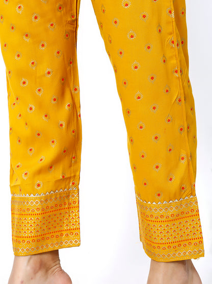 Add a touch of elegance and charm to your ethnic wardrobe with the Trendzmy Women Mustard Floral Printed Round Neck Anarkali Kurta With Trousers & Dupatta. Designed to offer both comfort and style, this ensemble is perfect for festive occasions, family gatherings, or casual outings.